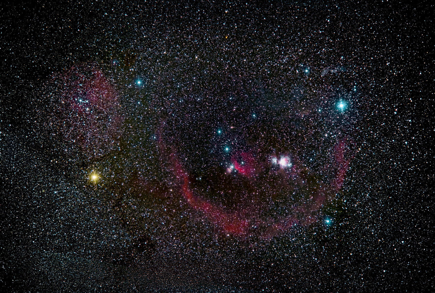 En la imagen se pueden observar el Bucle de Barnard, al Anillo Molecular Lambda Orionis, Nebulosa de la Flama, Nebulosa Cabeza de Caballo, Nebulosa de Orión, Nebulosa de la cabeza de Bruja, M78.