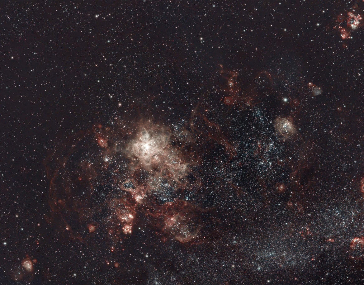 La Nebulosa de la Tarántula, también conocida como 30 Doradus y NGC 2070, es una región H II que se encuentra en la Gran Nube de Magallanes, galaxia satélite de la Vía Láctea. Con una magnitud aparente de 8, la nebulosa es un objeto extremadamente luminoso, considerando que se encuentra a unos 170.000 años luz (AL) de distancia. Su luminosidad absoluta es tal, que si se encontrara a la misma distancia de la Tierra que la nebulosa de Orión (1.344 AL), llegaría a producir sombras.