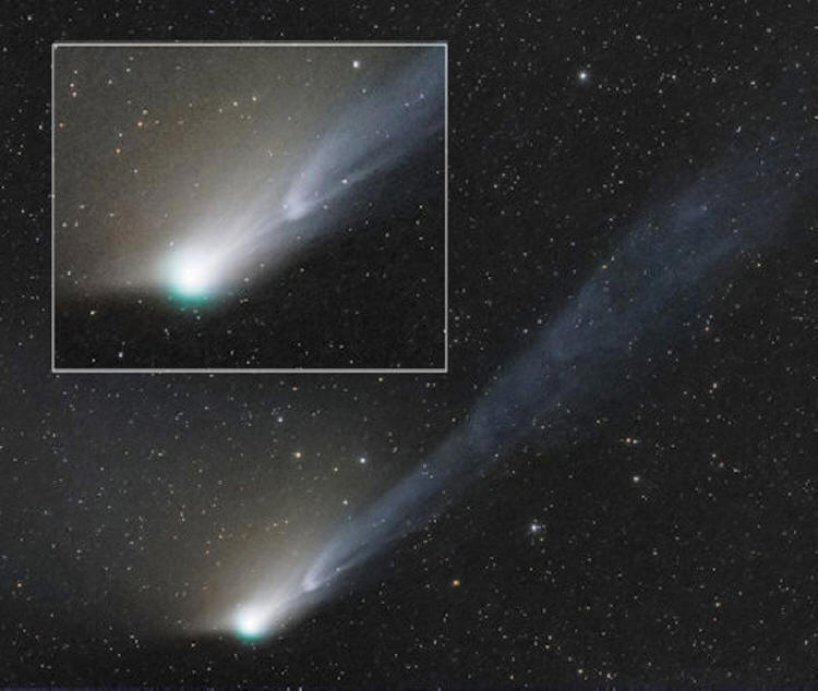Nótese la estructura cerca del núcleo del cometa (recuadro). A esto se le llama "evento de disrupción/desconexión". El evento es causado por una CME (Eyección de Masa Coronal, una corriente rápida de viento solar) que golpea al cometa. Imágenes de estos eventos, muestran claramente los efectos de las condiciones climáticas espaciales turbulentas a la que son sometidos los cuerpos celestes, en este caso, al cometa 12P le fue arrancada su cola por el viento solar.