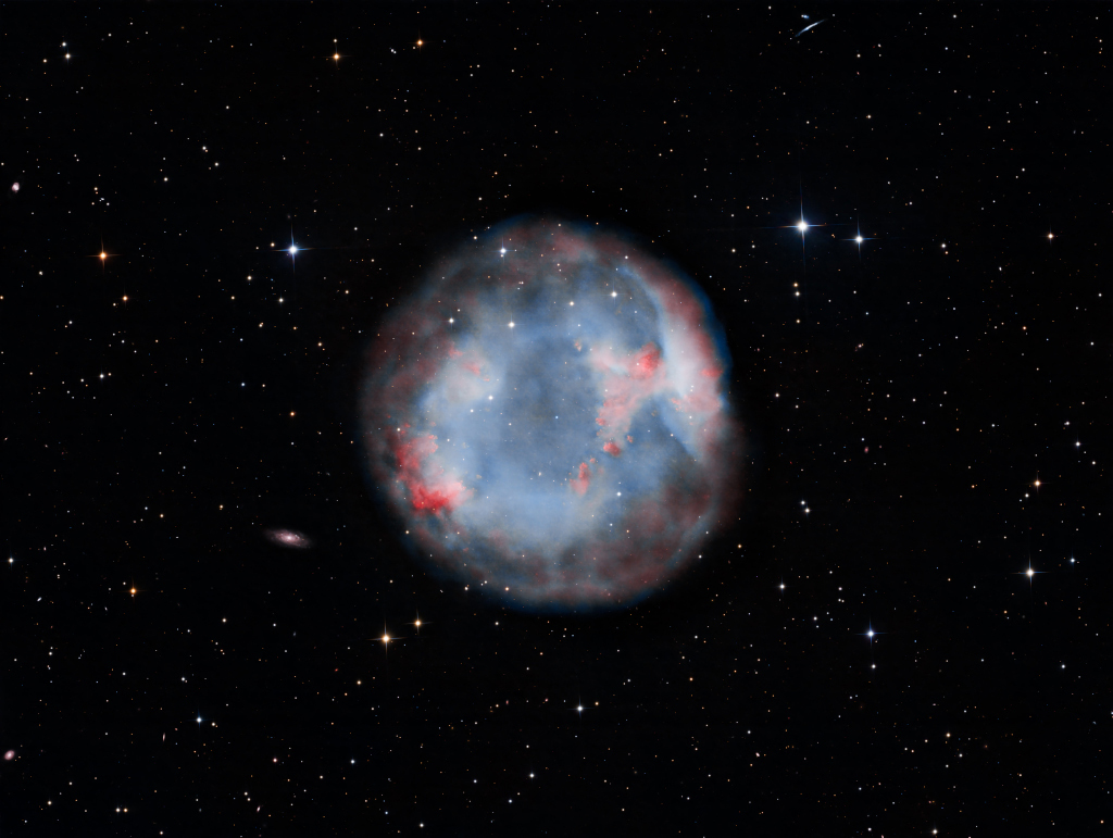 Ubicada a unos 1.800 años luz de distancia, esta hermosa nebulosa se encuentra hacia la constelación de Lepus, la Liebre, al sur de la constelación de Orión. Rodeada de estrellas de la Vía Láctea y cerca de la línea de visión de galaxias distantes de fondo, su forma esférica simple, de unos 8 años luz de diámetro, se revela en esta profunda imagen telescópica. Sin embargo, dentro de la nube cósmica hay estructuras hermosas y complejas.