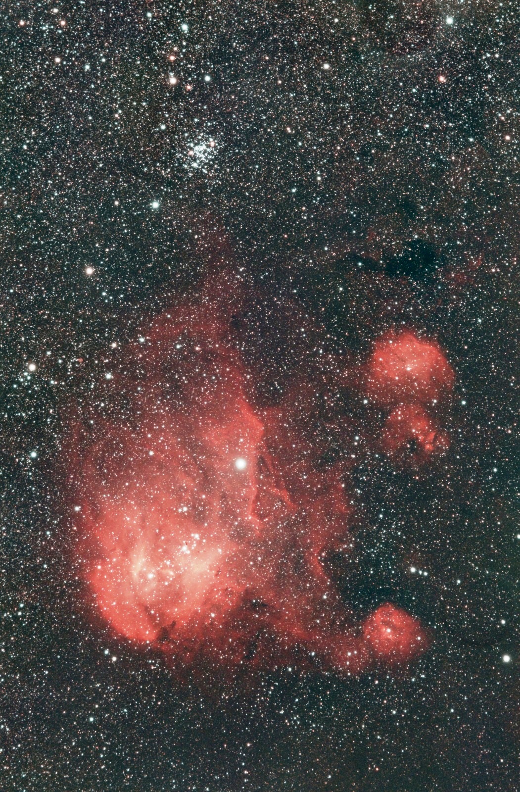 La nebulosa dista de nosotros en unos 6.500 años luz, mientras que el cúmulo de la Perla (NGC 3766) en unos 5.500 años luz.