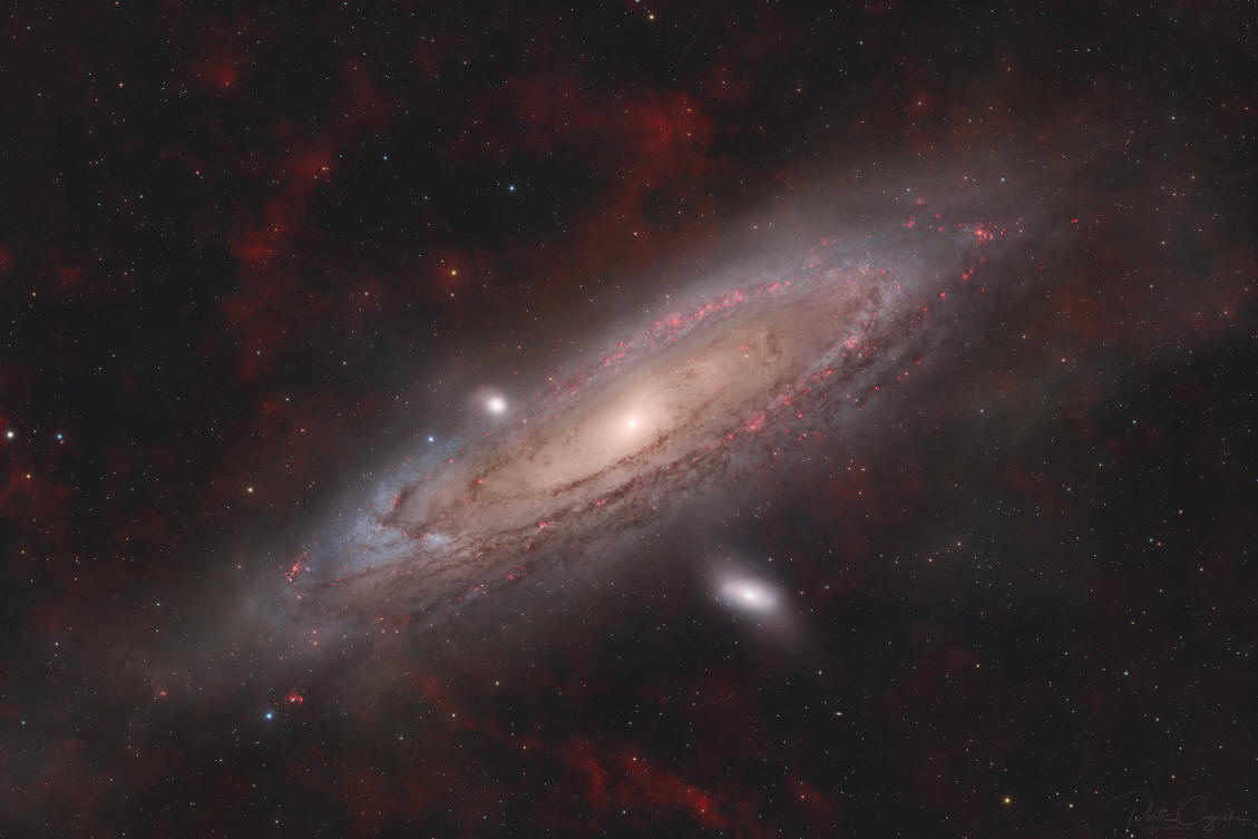 M32 y M110 son galaxias elípticas y satélites de la espiral más grande Andrómeda. La imagen es el resultado de combinar 60 horas de datos, capturados en banda ancha y banda estrecha. La vista telescópica profunda también revela detalles tentadores de carriles de polvo, cúmulos estelares jóvenes y regiones de formación estelar a lo largo los brazos espirales de Andrómeda, así como tenues nubes de gas de hidrógeno brillante en primer plano. Por ahora, Andrómeda y sus compañeras están a unos 2,5 millones de años luz de nuestra galaxia, la gran espiral Vía Láctea.
