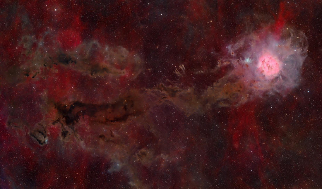 Esta toma es una colaboración entre dos fotógrafos británicos, ambos utilizando refractores f/7.7 de 5 pulgadas para realizar un total de 224,7 horas de exposición con filtros HαLRGB.