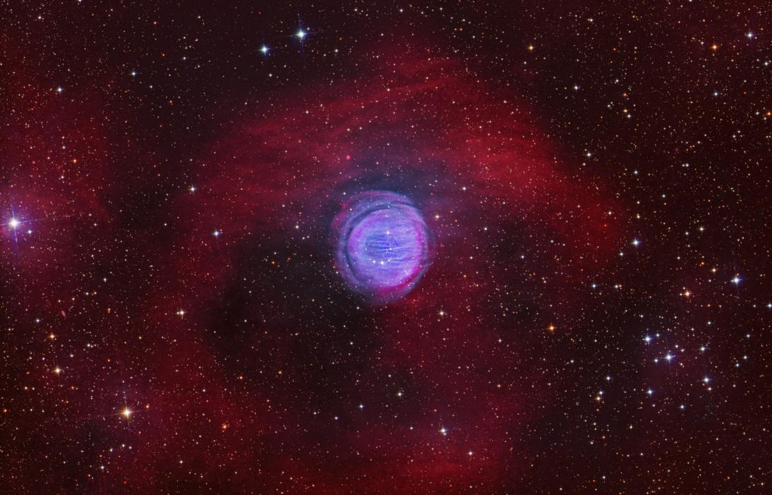 Esta nebulosa planetaria en Casiopea — los restos de una estrella moribunda que se deshace de sus capas externas — es difícil de capturar, ya que su brillo proviene principalmente del hidrogeno ionizado; esto la hace débil frente a los filtros RGB de color estándar.