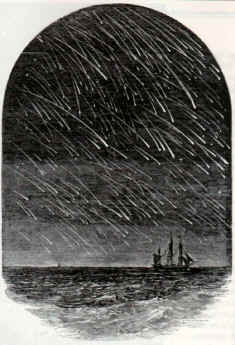 Una de las lluvias de meteoros que más ha impresionado a la humanidad a través de la historia, es la lluvia de las Leónidas. La naturaleza variable y cíclica de la cantidad de meteoros de la lluvia, que permite a la misma adoptar característica de tormenta, ha producido una serie de teorias, que van desde el polvo volcánico de la Luna de Pierre Simón de Laplace (en 1802), hasta la teoría cataclísmica de la colisión de un planeta con asteroides, que produjo un cinturón de materia en donde penetraría la Tierra en su órbita en trono al Sol. La ocurrencia de las tormentas de meteoros en las Leónidas, ha sido registrada desde hace muchos años. Es prácticamente la que origina el término de "lluvia de estrellas". Grabado de las Leónidas de 1799. |