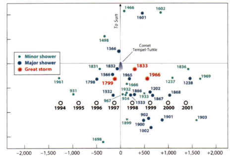Después de la tormenta de meteoros del 12 de noviembre de 1833, los registros escritos de Alejandro de Humboltd, de la tormenta del 12 de noviembre de 1799, observada desde Cúmana, Capitanía General de Venezuela y de Andrew Ellicot, desde Cabo Florida, en Estados Unidos de Norteamérica, sirvieron para establecer la periodicidad de 33 años de la Tormenta de las Leónidas.