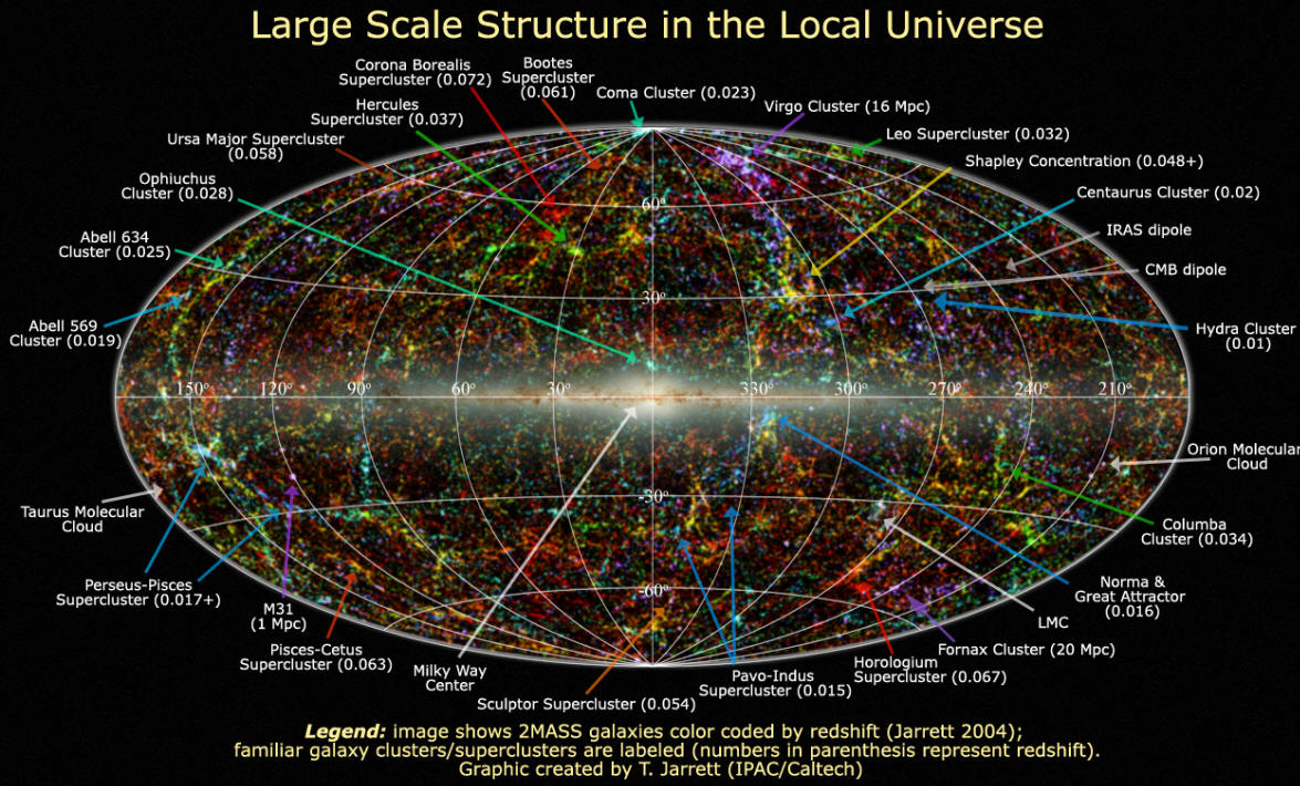 Las galaxias han sido coloreadas dependiendo de su corrimiento al rojo (z), obtenido a partir de los catálogos UGC, CfA, Tully NBGC, LCRS, 2dF, 6dFGS y SDSS. Las fuentes más cercanas se muestran en azul (z < 0.01); Las fuentes a distancias moderadas se muestran en color verde (0.01 < z < 0.04); Las fuentes más lejanas que el catálogo 2MASS puede resolver, se muestran en color rojo (0.04 < z < 0.1).