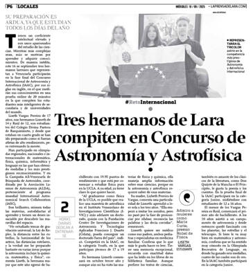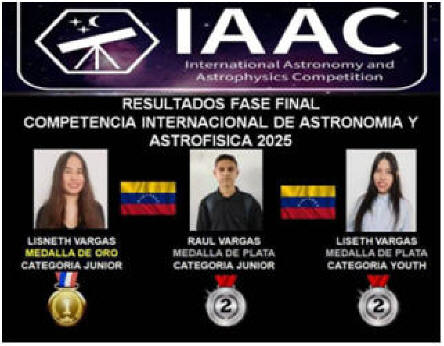 La Asociación Larense de Astronomía, ALDA, divulgó la noticia del excelente desempeño de los hermanos Vargas (Liseth, Lisneth y Raúl) en la Competencia Internacional de Astronomía y Astrofísica, IAAC, del año 2025, al haber accedido a la final de ese evento.