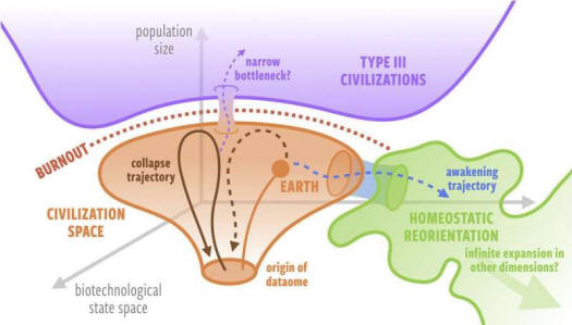 Los investigadores describen su hipótesis como una escala superlineal, donde una civilización crece exponencialmente, colonizando otros mundos hasta que se vuelven incapaces de sostener las demandas de energía de su constante invasión. Eventualmente, si no tomaban medidas, llegarían a una singularidad, un punto sin retorno, en el que no podrían salvar a su civilización del colapso. Señalan que si no fuera por las grandes distancias involucradas, probablemente detectaríamos fácilmente evidencia de una civilización alienígena al borde del colapso porque estaría emitiendo enormes cantidades de energía.