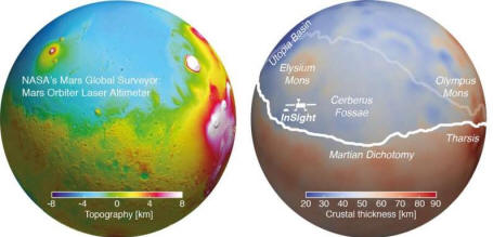 Combinando sus resultados recién obtenidos con los datos existentes sobre la gravedad y la topografía de Marte, los investigadores pudieron determinar el grosor de la corteza marciana. Tiene un promedio de 42 a 56 kilómetros. En promedio, la corteza es más delgada en la cuenca de impacto de Isidis a unos 10 km y más gruesa en la provincia de Tharsis a unos 90 km. Para poner esto en perspectiva, los datos sísmicos indican que la corteza terrestre tiene un espesor promedio de 21 a 27 kilómetros, mientras que la corteza lunar, determinada por los sismómetros de la misión Apolo, tiene entre 34 y 43 kilómetros de espesor.