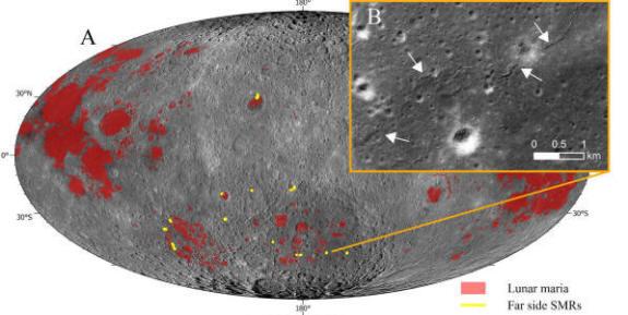 Distribución de (A) Distribución de los SMR del lado lejano (polilíneas amarillas) en relación con los mares lunares (polígonos rojos) y superpuestas sobre un mosaico global de la cámara gran angular LROC centrado en un meridiano de 180°. (B) Imagen a pequeña escala (LROC NAC M1392716156LE) del cúmulo de SMR de SPA que muestra segmentos de cresta individuales (flechas blancas). Crédito de la imagen: Crédito: The Planetary Science Journal (2025). DOI: 10.3847/PSJ/ad9eaa.