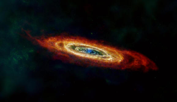 Imagen de la galaxia de Andrómeda, que incluye datos de la misión Herschel de la ESA, complementados con datos del observatorio retirado Planck y de dos misiones retiradas de la NASA: IRAS) y COBE. Crédito de la imagen: ESA/NASA/JPL-Caltech/GBT/WSRT/IRAM/C. Clark (STScI).