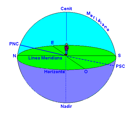 Polos celestes: Intersección de la proyección del Eje del mundo con la Esfera Celeste. Se distinguen el Polo Norte Celeste (PNC) y Polo Sur Celeste (PSC).