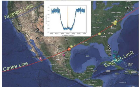 Trayectoria de la ocultación del 15 de agosto de 2018 y perfil de la misma. Se nota el descenso casi perpendicular de la luz estelar debido a lo poco densa de la atmósfera, y el destello central producido por la reflexión de los haces de luz estelar en la alta atmósfera de Plutón.